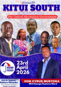 Day Two – Thursday, April 23, 2026 The leaders will traverse Kitui Central (Kalundu, 10:00AM), Kitui East (Chuluni, 11:00AM) and Kitui Rural (Kisasi, 12:00PM), before heading to Kitui South with stops in Ikanga, Kyatune, Mutomo, Kyoani, Ikutha and Mwangeni between 12:30PM and 4:00PM.